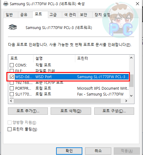 바로 위 이미지 와 같이 포트가 WSD로 되어 있는 경우의 발생 입니다. WSD는 윈도우에서 제공하는 포트로 프린터나 복합기와 기기를 자동으로 연결 해주는 것 으로 Web Service Dynamic Discovery(WS-Discovery) 프로토콜 입니다. WSD 윈도우에서 제공하는 웹 서비스(WSD)용 프로토콜 입니다. 프린터나 복합기가 연결되면 자동으로 인식하여 연결해서 사용이 가능하게 해주고, 사용자가 드라이버를 설치 하지 않아도 자동적으로 생성이 됩니다. (이 또한, 윈도우10의 호환 드라이버{즉 정식적인 드라이버가 아님} 가 설치 되어 자동으로 생성 되게 됩니다.) ※ 스캔(scan)이 사용 가능한 복합기에서는 호환드라이버로 설치되어진 프린터에서는 스캔이 불가능하게 됩니다. 중요!! (ps... 간혹 최신 윈도우 업데이트 내에 설치가 되어진 프린터/복합기가 있긴 합니다.)