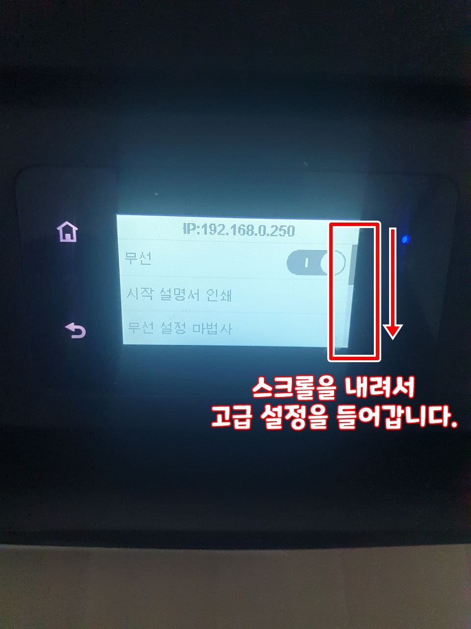 우선 적으로 천둥번개나 전류의 흐름에 간섭이 생겨 정전이 생겼을 경우 DHCP(자동할당)로 설정 했다면 IP가 자동으로 바뀌게 됩니다. 이를 방지하기 위해 고정 IP를 기입합니다. 1. 프린터/복합기의 정면에 보이는 와이파이 모양 혹은 유선네트워크 모양 을 클릭하여 설정 항목을 들어갑니다. 2. 톱니바퀴 모양의 설정 항목을 들어 갑니다. 3. 우리의 검지손가락으로 스크롤을 쭉 내려줍니다.