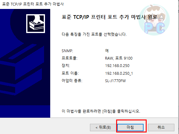 프린터 이름 또는 IP 주소 에 현재 내 프린터/복합기에 대한 IP를 입력 합니다. 포트 이름에 간혹 내 프린터/복합기에 대해 192.168.0.250"_1" 이 붙을 때가 있는데 이것은 입력했던 IP가 존재함으로 복사본으로 하나 더 추가를 하겠다는 의미 입니다. 그냥 무시 하시고 다음 버튼을 눌러 마무리 지어 주시면 됩니다.