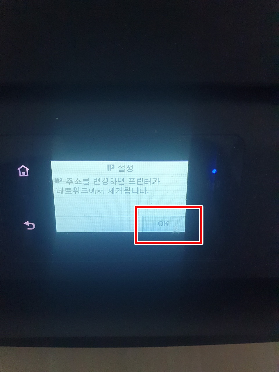 4. 고급 설정 항목을 들어갑니다. 5. IP 설정 항목 을 들어갑니다. 저 같은경우 수동으로 기입 되 있기 때문에 수동으로 설정 되어 있습니다. 6. IP 주소를 변경하면 프린터가 네트워크에서 제거됩니다. 라는 문구가 뜹니다. OK 를 클릭 합니다. (프린터만 사용하시는 분들은 관계 없지만 스캔을 사용하시는 분들은 이 설정 후 드라이버 재설치 해주세요.)