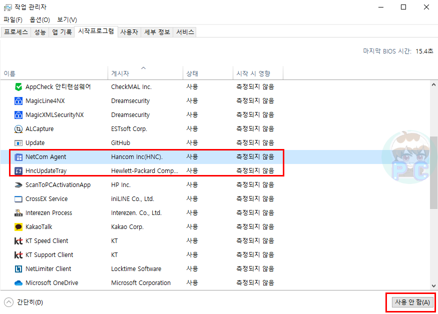 작업 관리자 창에서 HncUpdateTray, NetCom Agent 사용 안 함 으로 변경하기