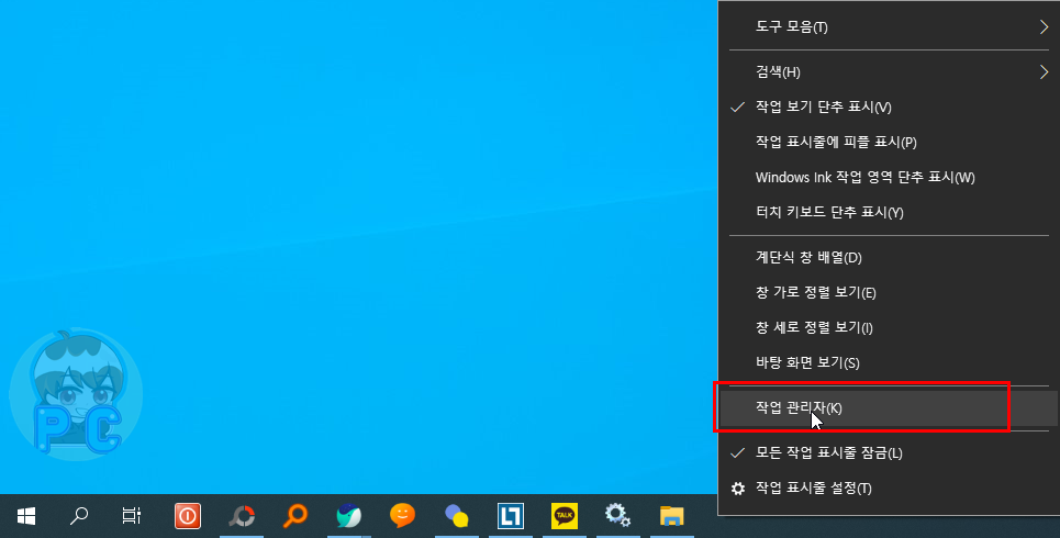 1. 작업 표시줄에 마우스 우측 버튼을 클릭 하여 작업관리자 창을 열어줍니다.