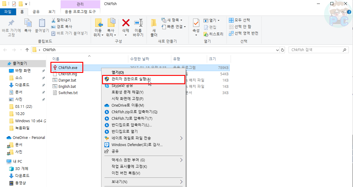 프로그램 ChkFlash.exe 를 마우스 우측버튼을클릭하여 관리자 권한으로 실행을 합니다.