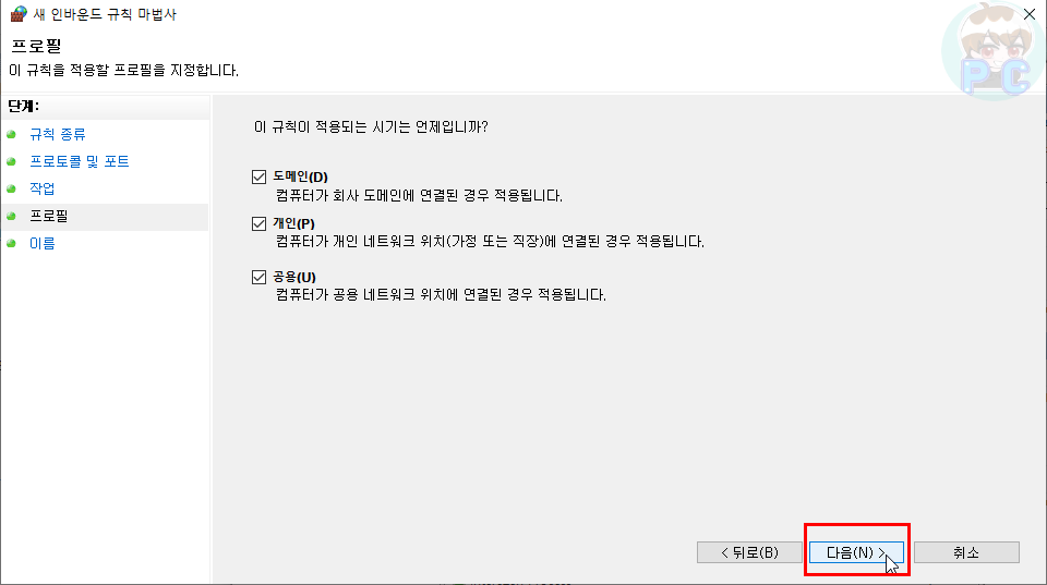 마찬가지로 도메인 개인 공용 체크 되어있는지 확인 후, 다음 버튼을 클릭 합니다.