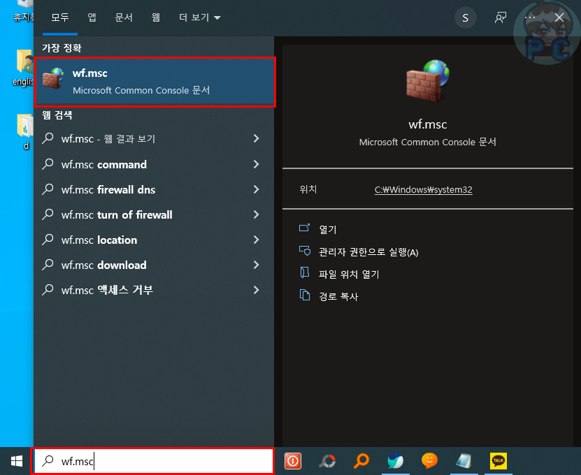 윈도우 검색창에 wf.msc(윈도우 방화벽)을 입력하여 들어갑니다.
