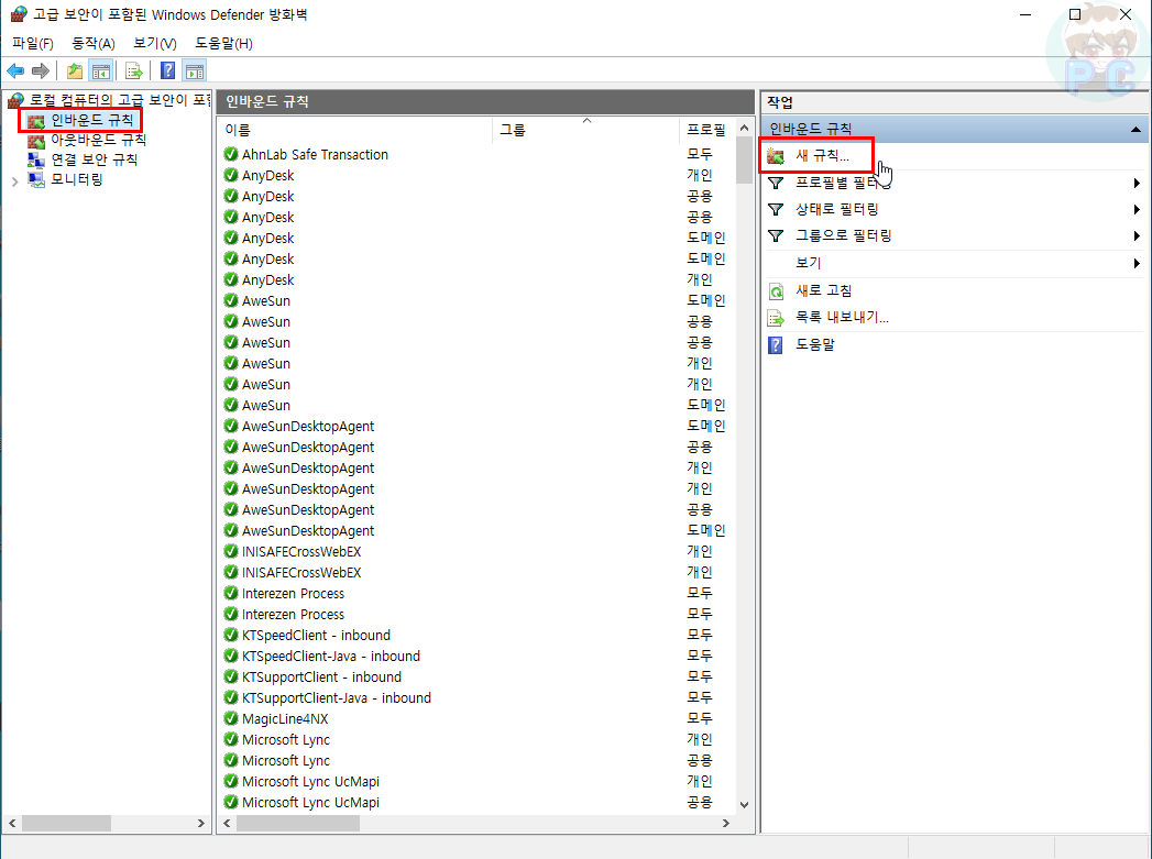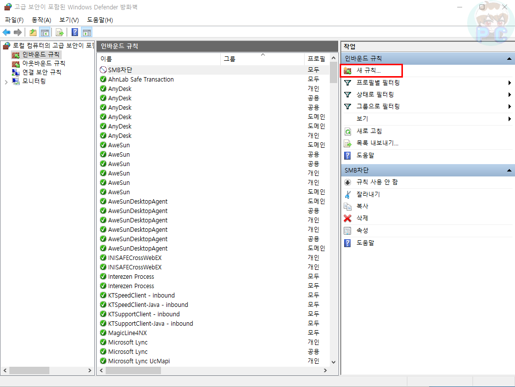 왼쪽 항목 중에 인바운드 규칙 을 클릭하고 새 규칙버튼을 클릭 합니다.