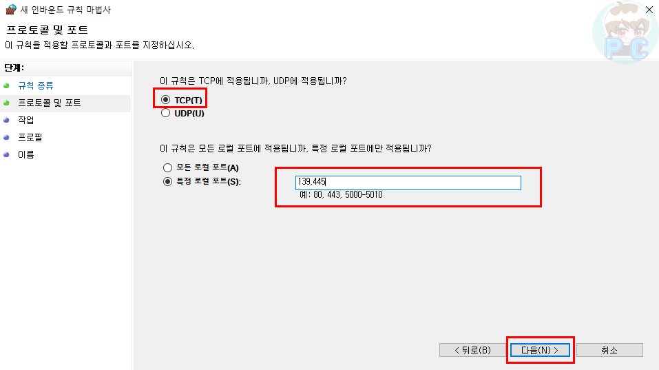 특정 로컬 포트를 선택 후, 139 와 445 포트를 입력합니다.