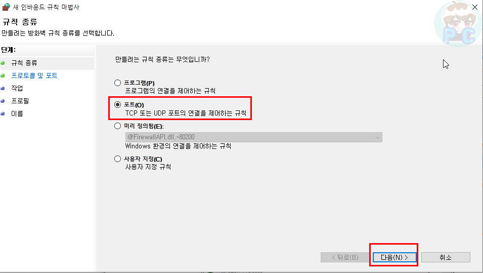 새 인바운드 규칙 마법사 창이 열리면, 여기에 포트 항목에 체크 해준 후 다음 버튼을 클릭합니다.