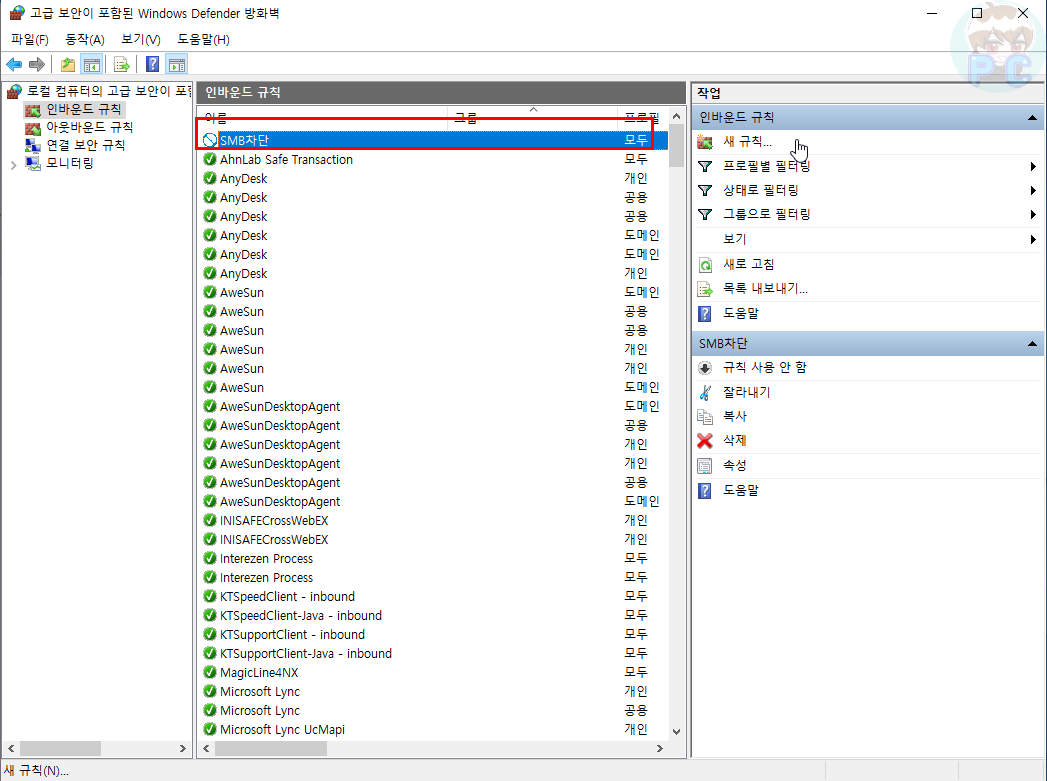 이름과 설명이 나오는데, 사용자가 쉽게 알아 볼 수 있게 SMB 차단 으로 이름을 정의 하고