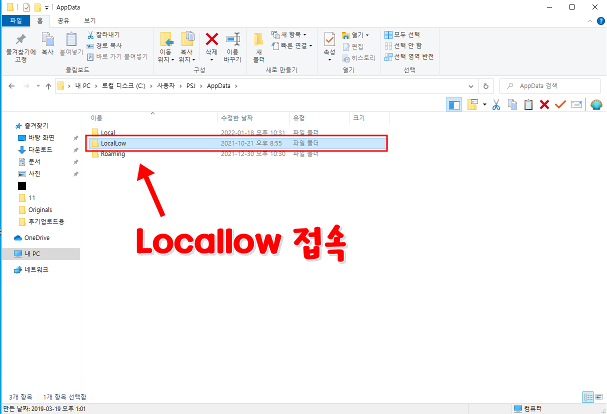 LocalLow 폴더로 접속합니다. (Local 폴더 아님x)
