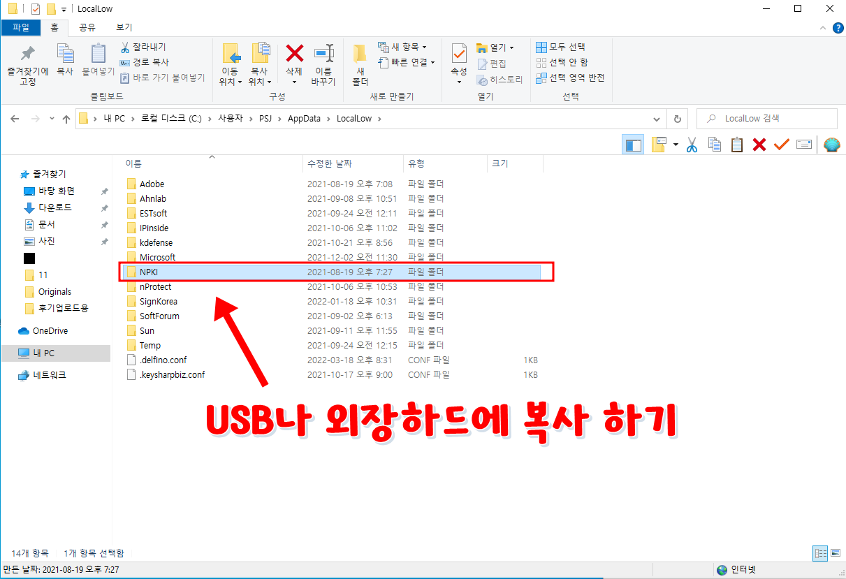 폴더로 들어가게 되면 NPKI(공인인증서)폴더가 보입니다. C드라이브나 프로그램 파일에서 보이는 NPKI가 아니고 윈도우7, 10,11 은 이런식으로 들어가셔서 USB나 외장하드에 백업 하시고 새로 포멧된 PC의 사용자계정명을 들어가 Locallow 폴더로 붙여넣기 해주셔야만 작동이 됩니다. (윈도우xp는 program files(x86)에 NPKI 가 존재합니다.)