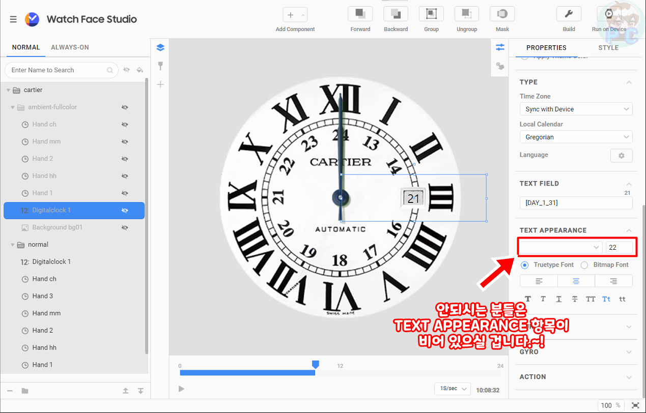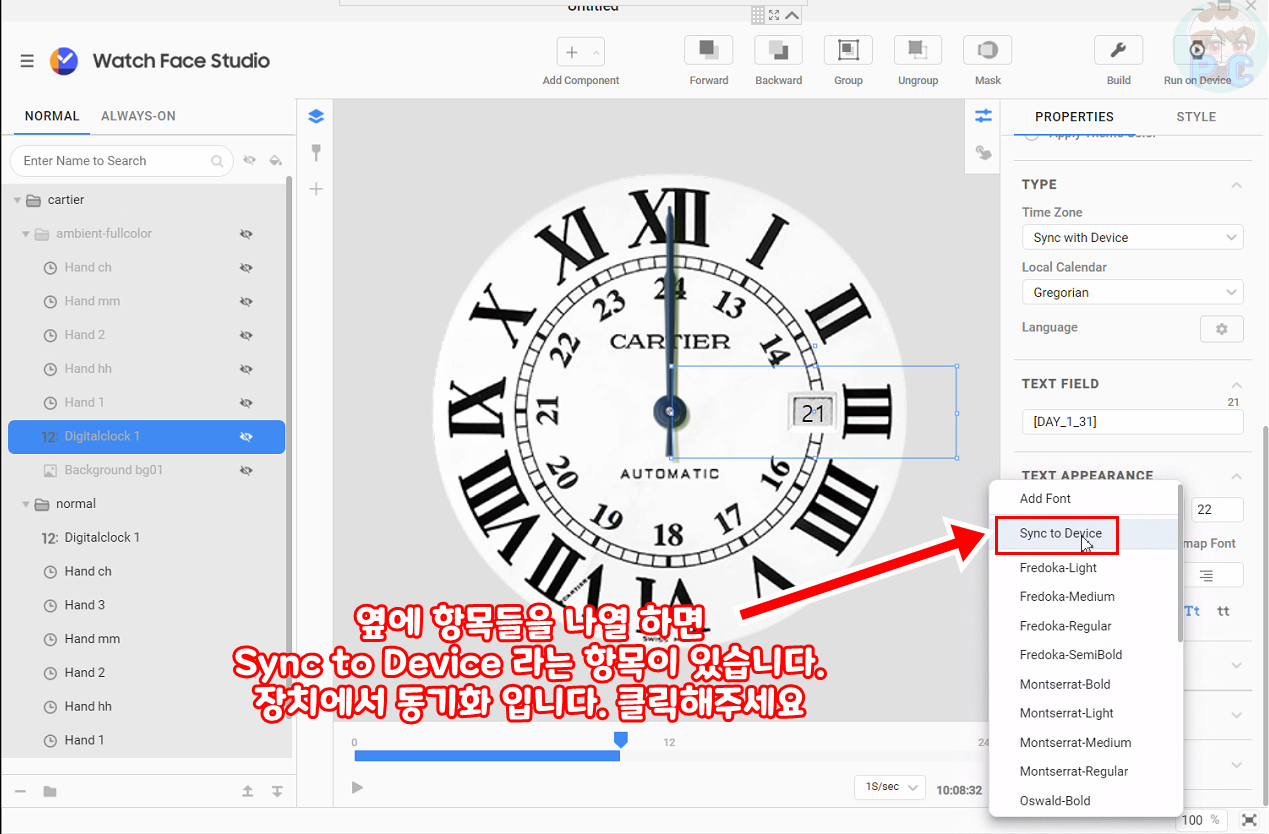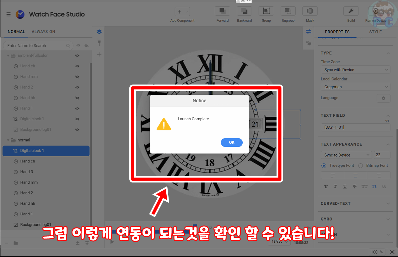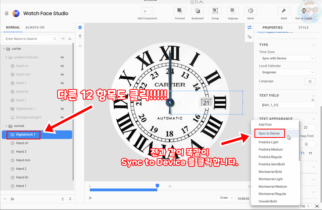 TEXT APPEARANCE 항목이 Sync to Device 선택이 되었다면 다시 Run on Device 를 클릭하셔서 진행해주세요!!!