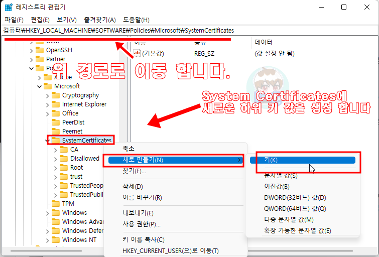 컴퓨터\HKEY_LOCAL_MACHINE\SOFTWARE\Policies\Microsoft\SystemCertificates