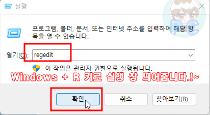 Windows키 버튼 + R 키를 눌러 실행창을 띄어 regedit 이라고 입력합니다.