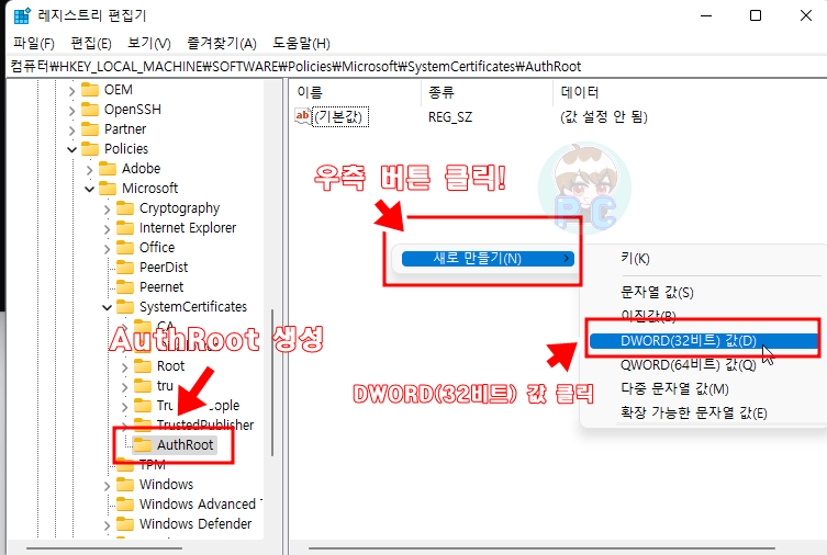 여기에 AuthRoot 라는 디렉토리가 없다면 하위 디렉토리로 새로운 키 값을 생성 합니다.