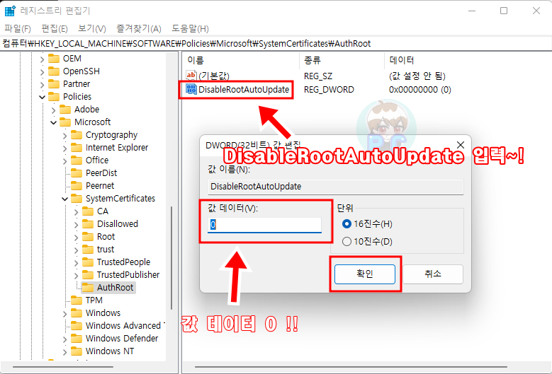 DisableRootAutoUpdate 라고 값 이름을 지정 해준 후 값 데이터를 0 으로 바꿔 주고 확인 눌러줍니다.