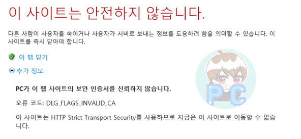 PC가 이 웹사이트의 보안 인증서를 신뢰하지 않습니다.