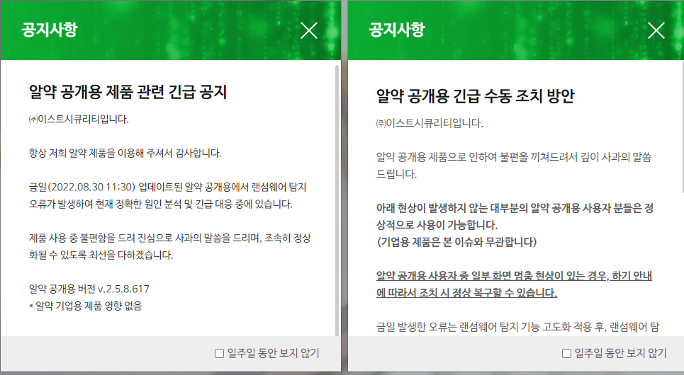 항상 저희 알약 제품을 이용해 주셔서 감사합니다. 금일(2022.08.30 11:30) 업데이트된 알약 공개용에서 랜섬웨어 탐지 오류가 발생하여 현재 정확한 원인 분석 및 긴급 대응 중에 있습니다. 제품 사용 중 불편함을 드려 진심으로 사과의 말씀을 드리며, 조속히 정상화될 수 있도록 최선을 다하겠습니다.