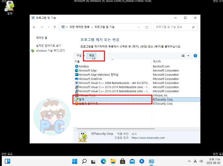 여기서 알약을 삭제 해주고 다시 재부팅 해주면 정상적으로 윈도우를 사용 할 수 있게 됩니다