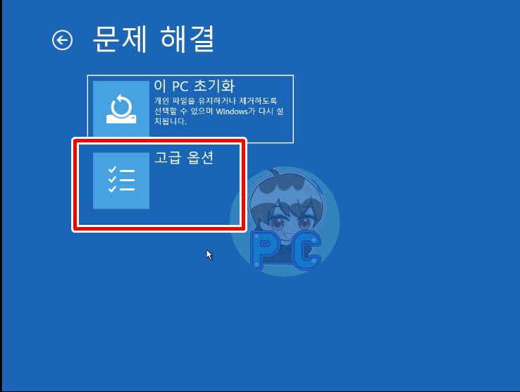 문제 해결 화면에서는 고급 옵션을 선택해줍니다.