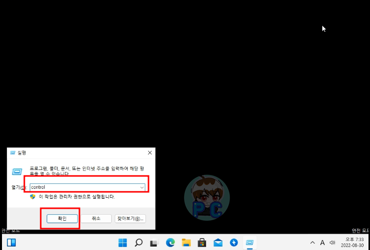 안전모드로 부팅이 되었다면 바탕화면 배경화면이 검정색으로 나와야 합니다. 이상태에서 윈도우즈 키 + R 키를 눌러 실행창을 띄웁니다. control 이라고 입력해서 제어판을 열어 줍니다.