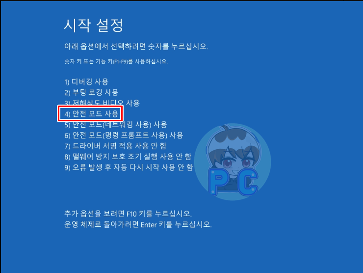 1) 디버깅 사용 2) 부팅 로깅 사용 3) 저해상도 비디오 사용 4) 안전 모드 사용<--------------- 4번 혹은 F4 키를 이용하여 들어갑니다. 5)안전 모드(네트워킹 사용) 사용 6) 안전 모드(명령 프롬포트 사용) 사용 7) 드라이버 서명 적용 사용 안 함 8) 맬웨어 방지 보호 조기 실행 사용 안 함 9) 오류 발생 후 자동 다시 시작 사용 안 함