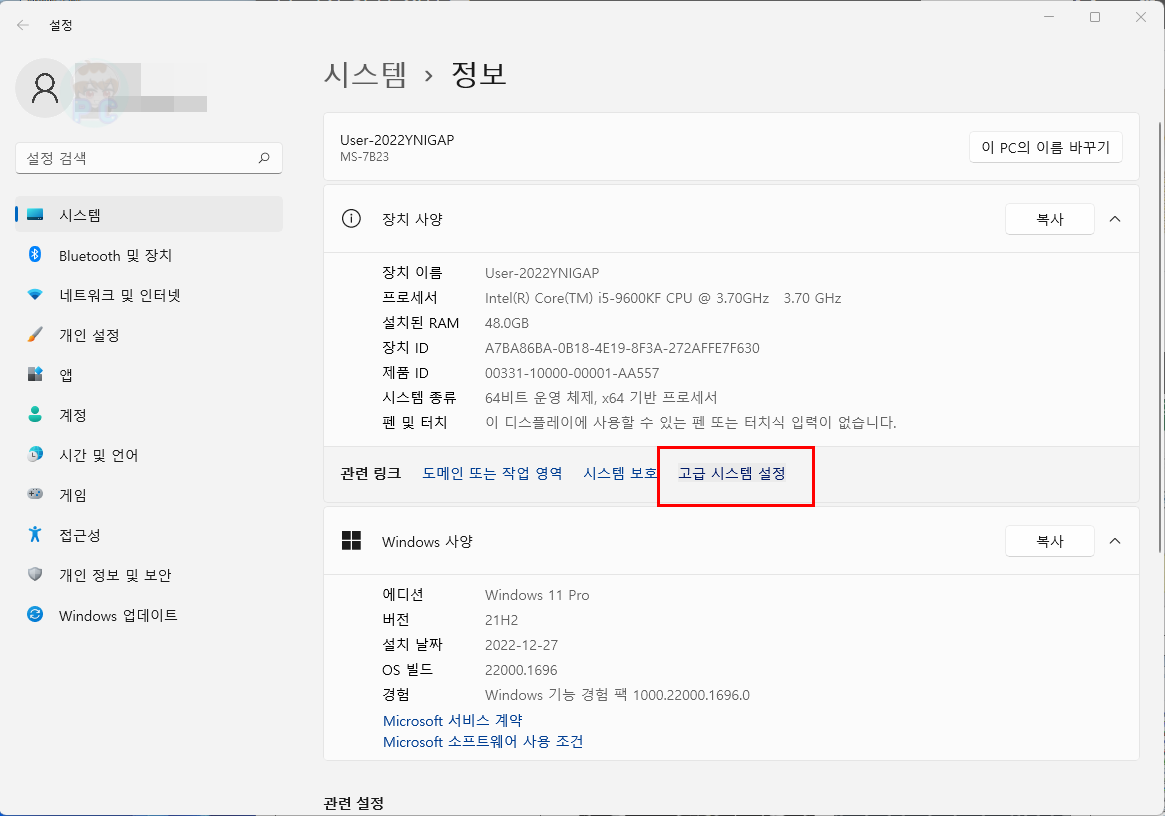 그러면 시스템 정보 창이 열리면서 중앙에 보시면 고급 시스템 설정이 있는데요. 이것을 클릭합니다.