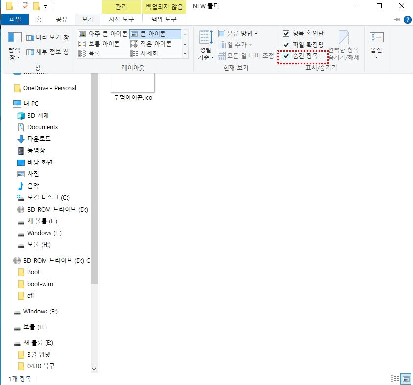 위 이미지 처럼 숨긴 항목을 체크해야 되는 번거로움(?)이 있습니다 그리고 파일 이름 또한 공란으로 두려면 특수문자를 찾아서 넣어야되는 번거로움이 있죠