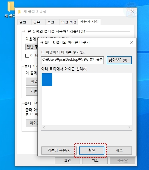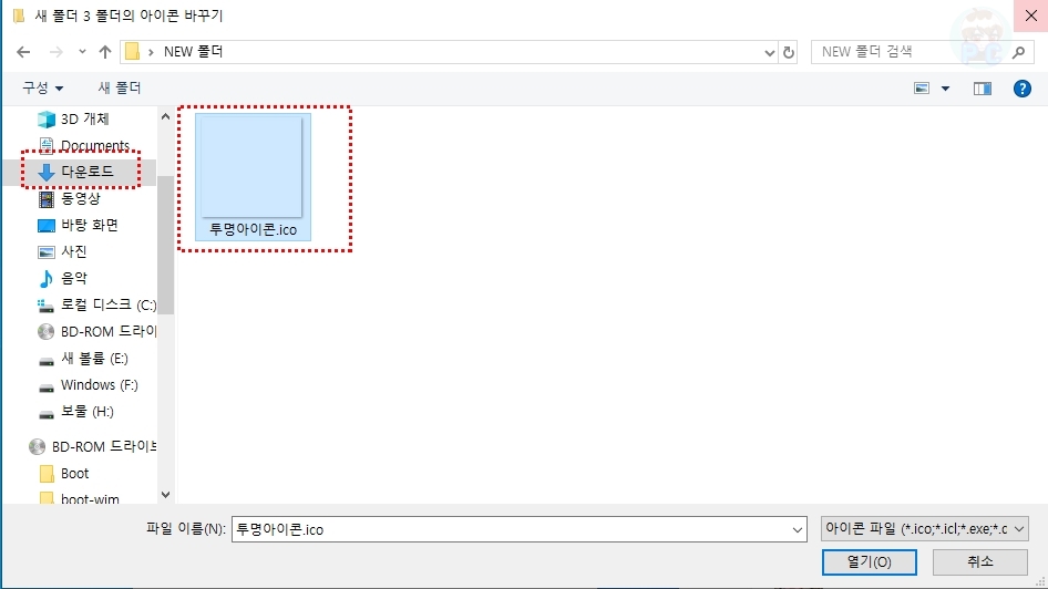 다시 본문으로 돌아와서 다운로드 받아놓은 투명 아이콘.ico 를 찾아보기를 해서 열어 줍니다.
