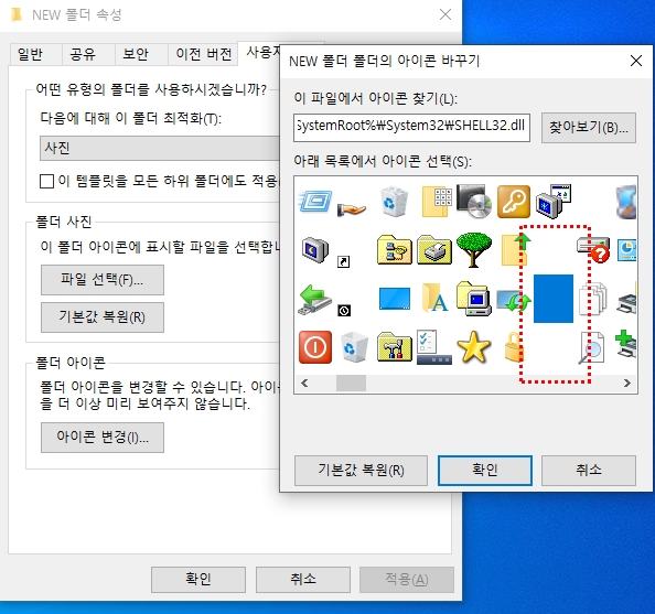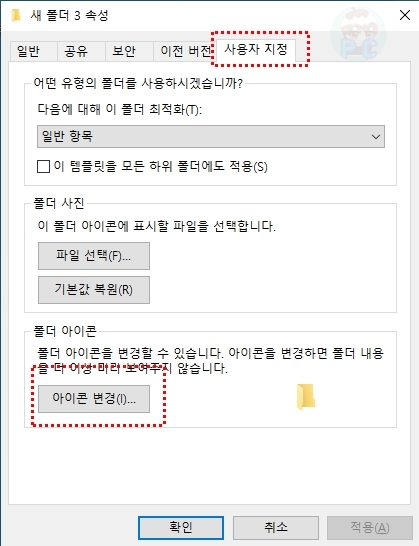 사용자 지정 항목을 이동해서 아이콘 변경 버튼을 클릭 합니다.