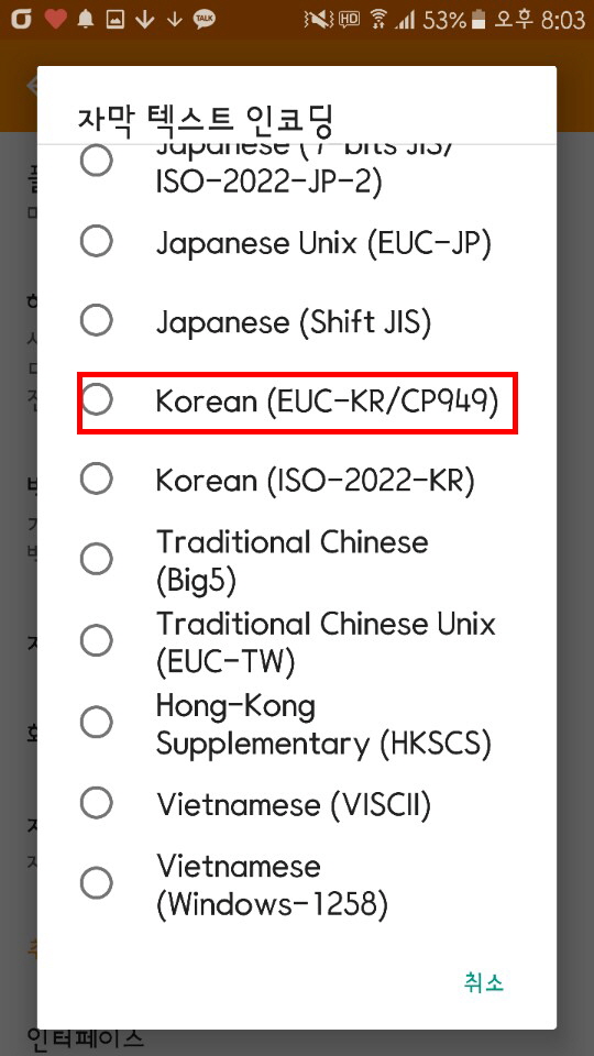 Korean(EUC-KR/CP949) 로 설정을 해주셔야 자막이 원활히 보입니다.