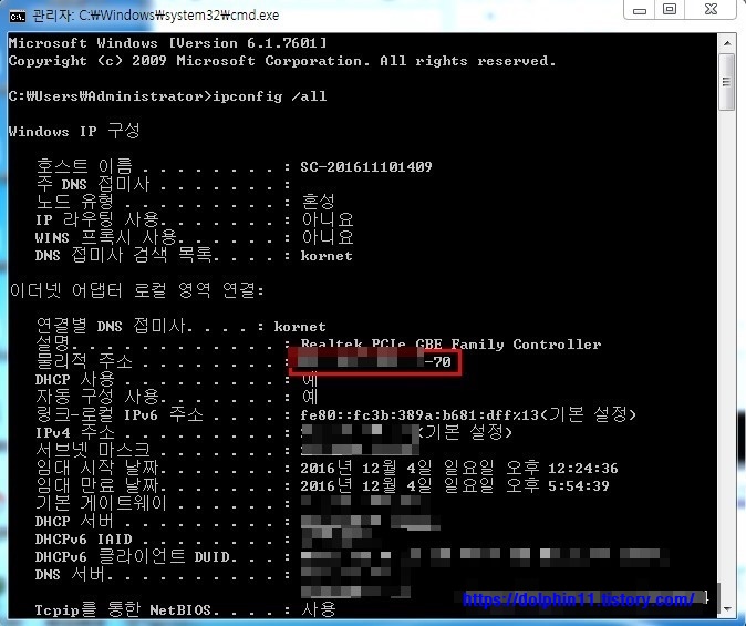 두번째로는 ipconfig /all하시면 내 현재ip주소와 서브넷 마스크등 여러 가지 인터넷 어댑터 정보들이 많이 나오실 겁니다. 그중에서물리적 주소 에 나온 MAC 주소가 있을 겁니다. 예를 들어11-22-33-44-55-00이 있다면 앞에 MAC 주소를 기억한 다음 맨 뒤 00만 숫자를 바꿔주는 겁니다.