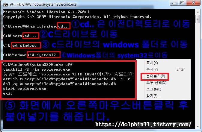 명령 프롬프트에서 iconcache.db 파일을 삭제하는 명령어 입니다. @echo off taskkill /f /im explorer.exe attrib %userprofile%\appdata\local\iconcache.db -s -r -h del /q %userprofile%\appdata\local\iconcache.db start explorer.exe exit