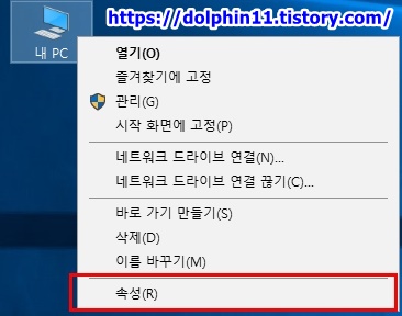 바탕화면에 보이시는 내 PC의 오른쪽 마우스버튼을 눌러 속성을 들어갑니다.