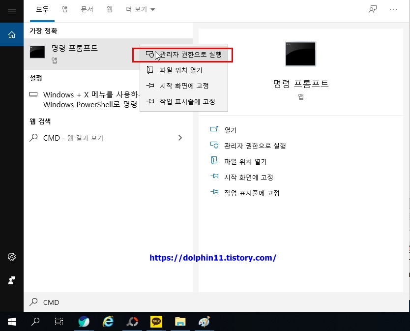 시작키를 눌러 cmd 를 입력 합니다. 그냥 엔터쳐서 열어 주시면 안되고 오른쪽 마우스버튼을 눌러 관리자 권한으로 실행 을 눌러 열어줍니다.