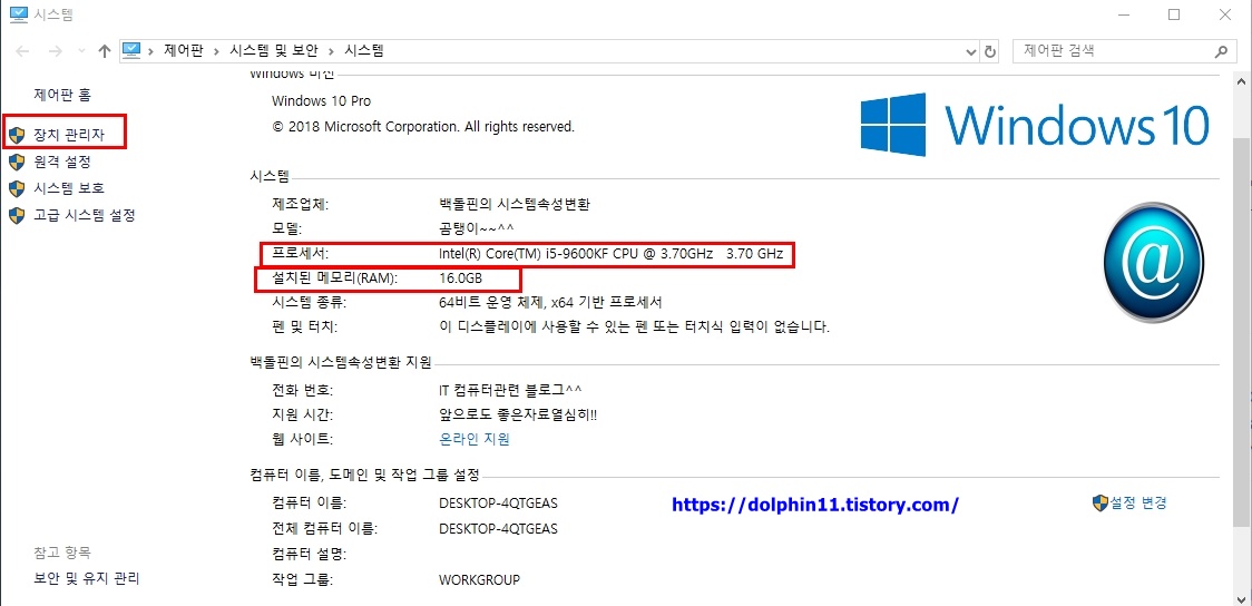 그럼 프로세서와 설치된 메모리가 바로 보이고 그밑에 시스템 종류에(CPU와 메모리사양확인가능)
