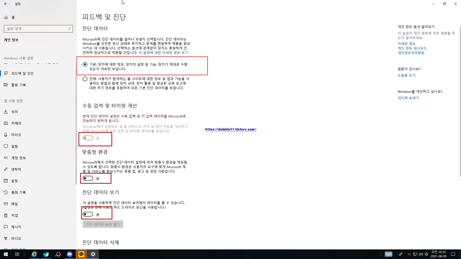만약 활성화가 된 상태에서 끔으로 되어있다면 그대로 두셔도 됩니다. 맞춤형 환경,진단 데이터보기 둘다 끔으로 해줍니다.